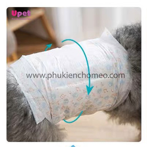 - Với thiết kế đơn giản, bạn chỉ cần xé băng dán ở trên tả chó đực, cuộn qua phía lưng rồi dán lại là xong. Mọi người không nên dán quá chặt vì sẽ ảnh hưởng tới dạ dày, chỉ cần dán làm sao để không bị tuột là được
