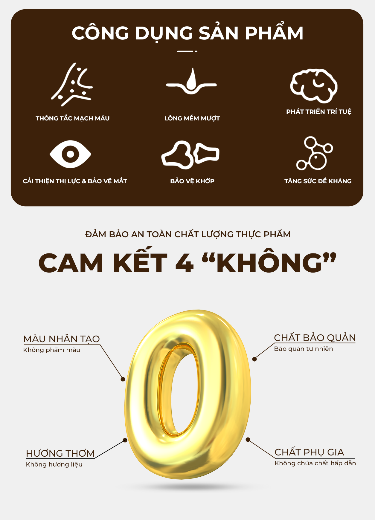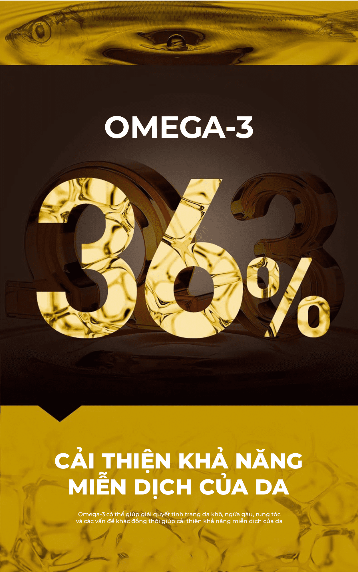 Sản phẩm chứa dầu cá (fish oil) nhằm bổ sung axit béo Omega-3, Axit eicosapentaenoic (EPA) và axit docosahexaenoic (DHA), hỗ trợ phát triển não bộ, cải thiện thị lực và tăng độ bóng mượt của lông, phòng ngừa và chữa trị các bệnh tim mạch do xơ vữa động mạch.